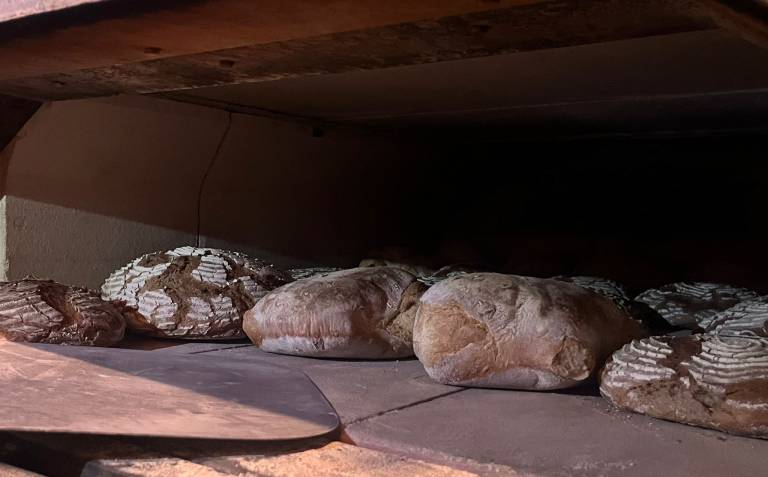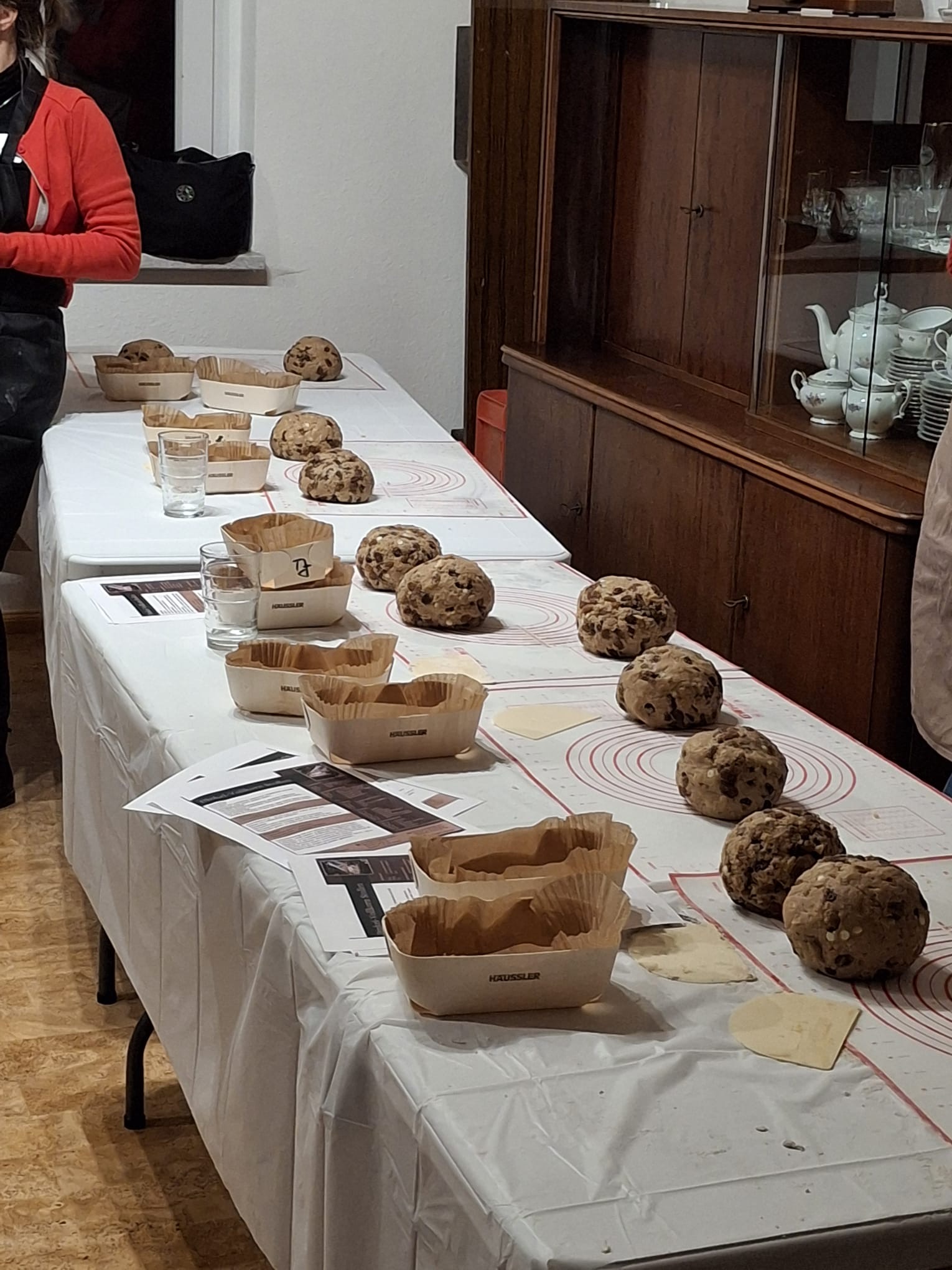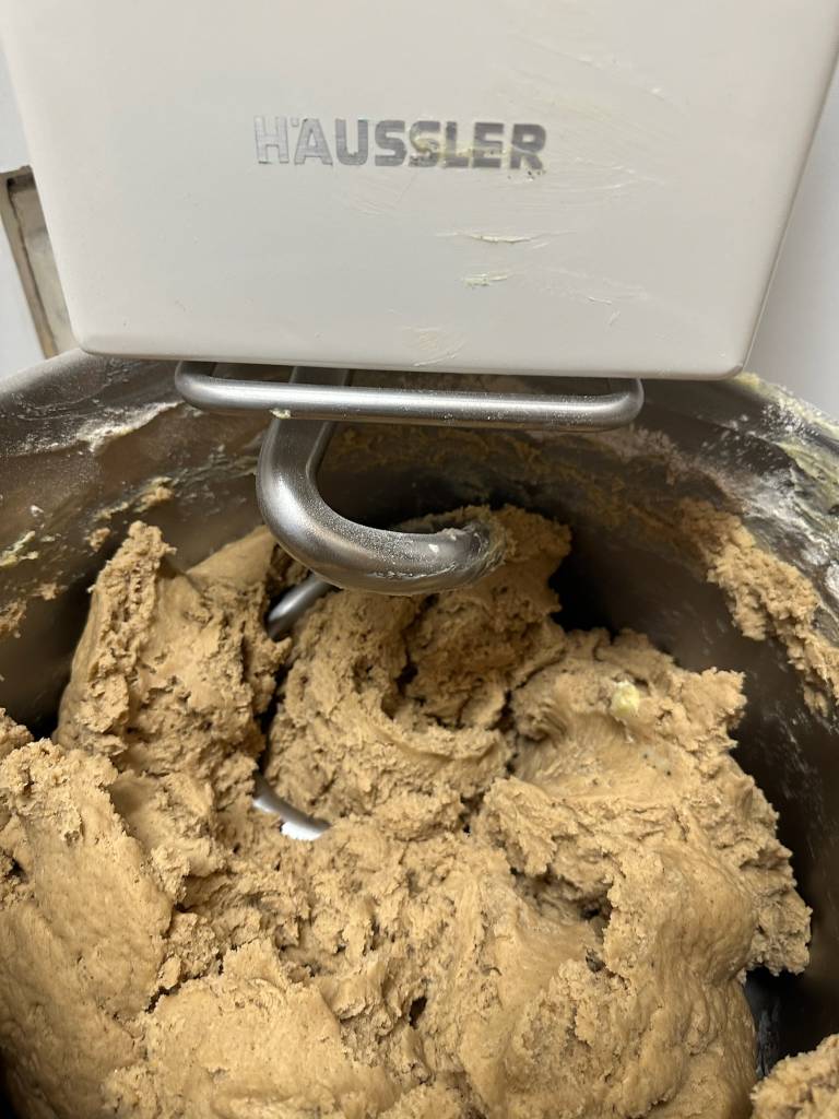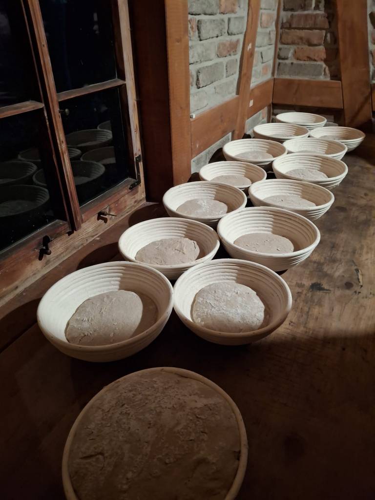 Doch zum langen Verweilen bleibt keine Zeit. Das würzige Menü will bereitet sein. Und so begeben sich die Bäcker hinüber ins Backhaus und widmen sich neben den theoretischen Grundlagen des Brotbackens dem Stollenteig, denn heute darf jeder anstelle des sonst üblichen Brotes einen kleinen Stollen mit nachhause nehmen und der will vorher gebacken sein. Da sind viele Zutaten nötigt und die werden mit einer großen Menge Butter verknetet. Köstlicher Duft verbreitet sich und die kleinen Laibe liegen bald bereit.