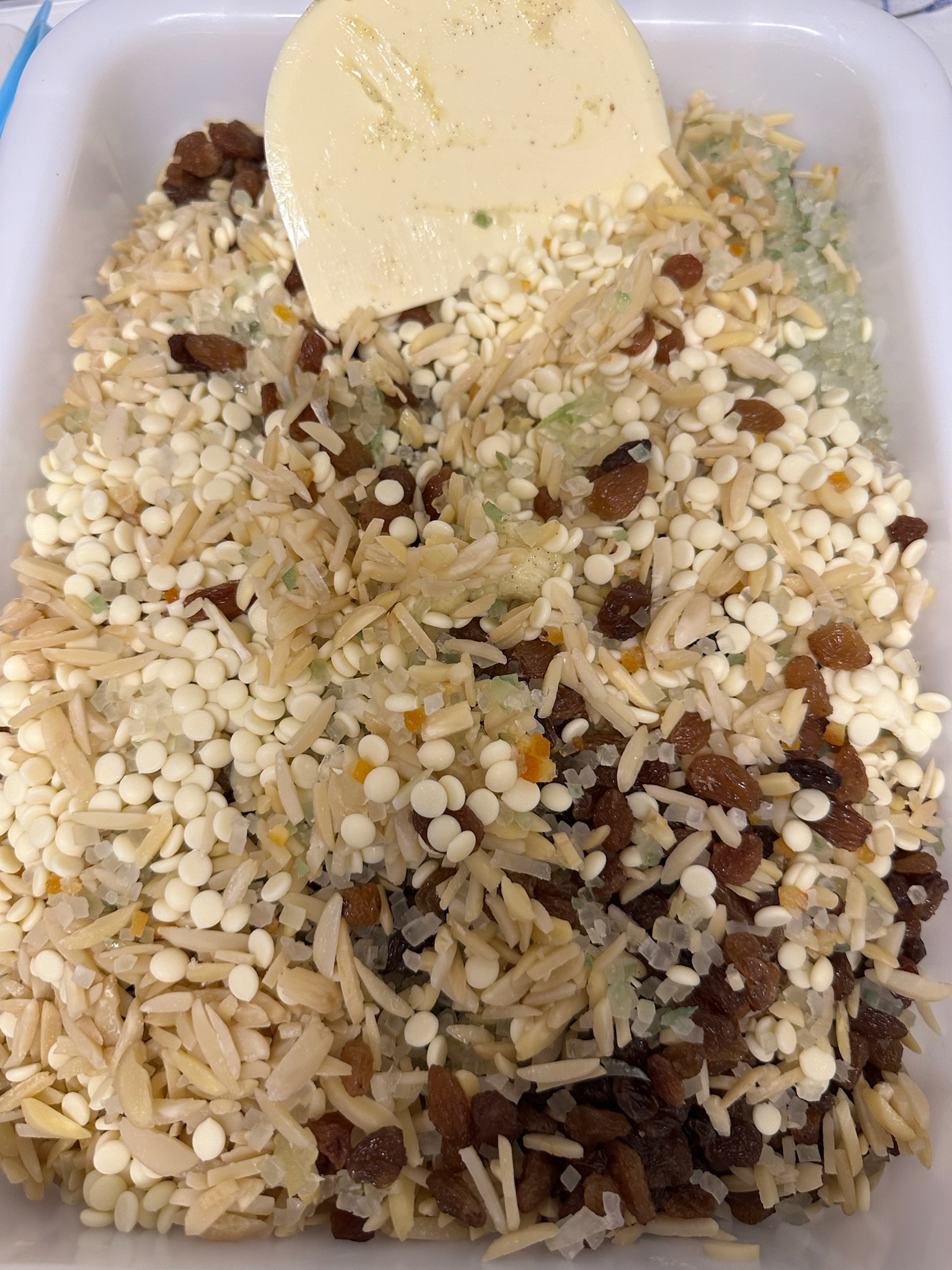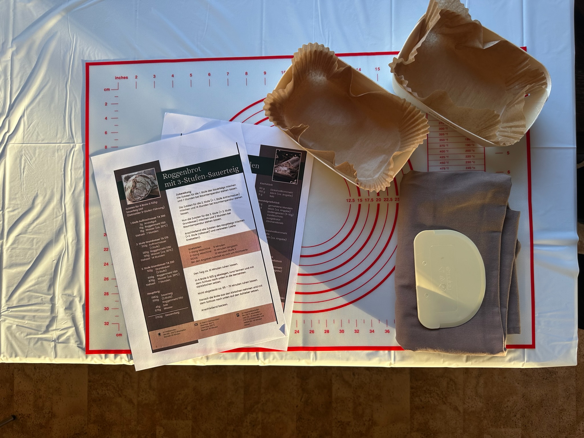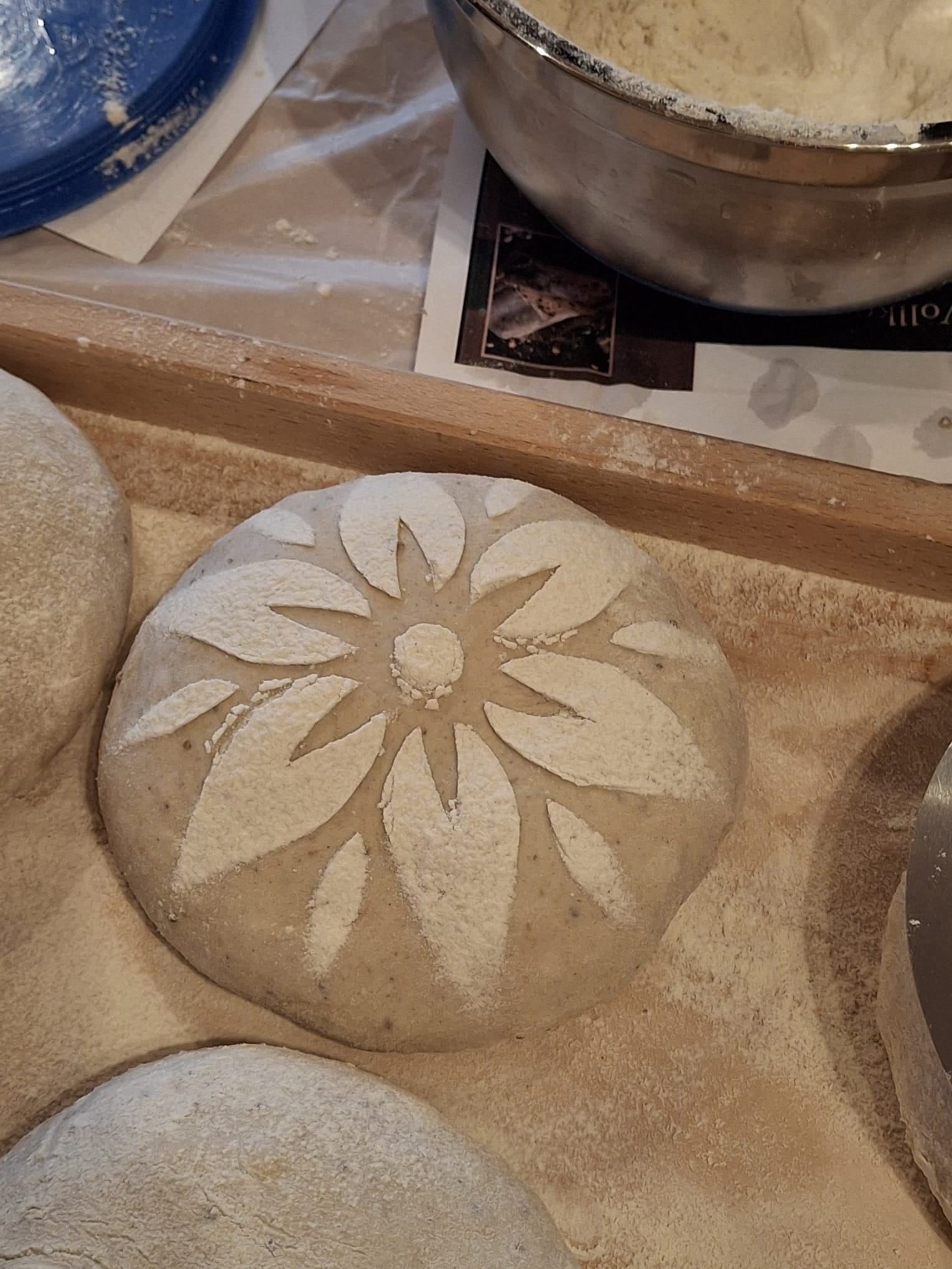 Doch zum langen Verweilen bleibt keine Zeit. Das würzige Menü will bereitet sein. Und so begeben sich die Bäcker hinüber ins Backhaus und widmen sich neben den theoretischen Grundlagen des Brotbackens dem Stollenteig, denn heute darf jeder anstelle des sonst üblichen Brotes einen kleinen Stollen mit nachhause nehmen und der will vorher gebacken sein. Da sind viele Zutaten nötigt und die werden mit einer großen Menge Butter verknetet. Köstlicher Duft verbreitet sich und die kleinen Laibe liegen bald bereit.