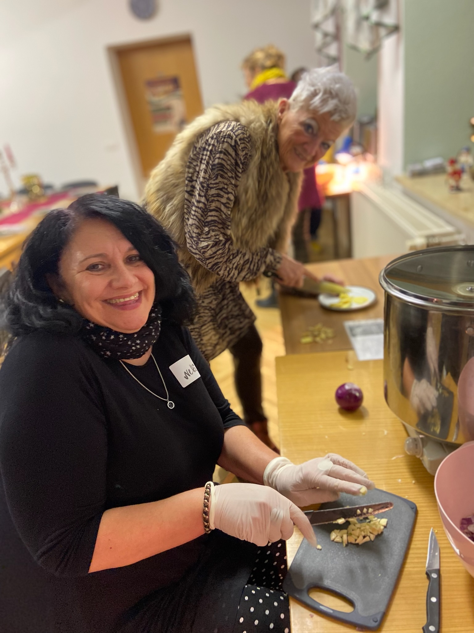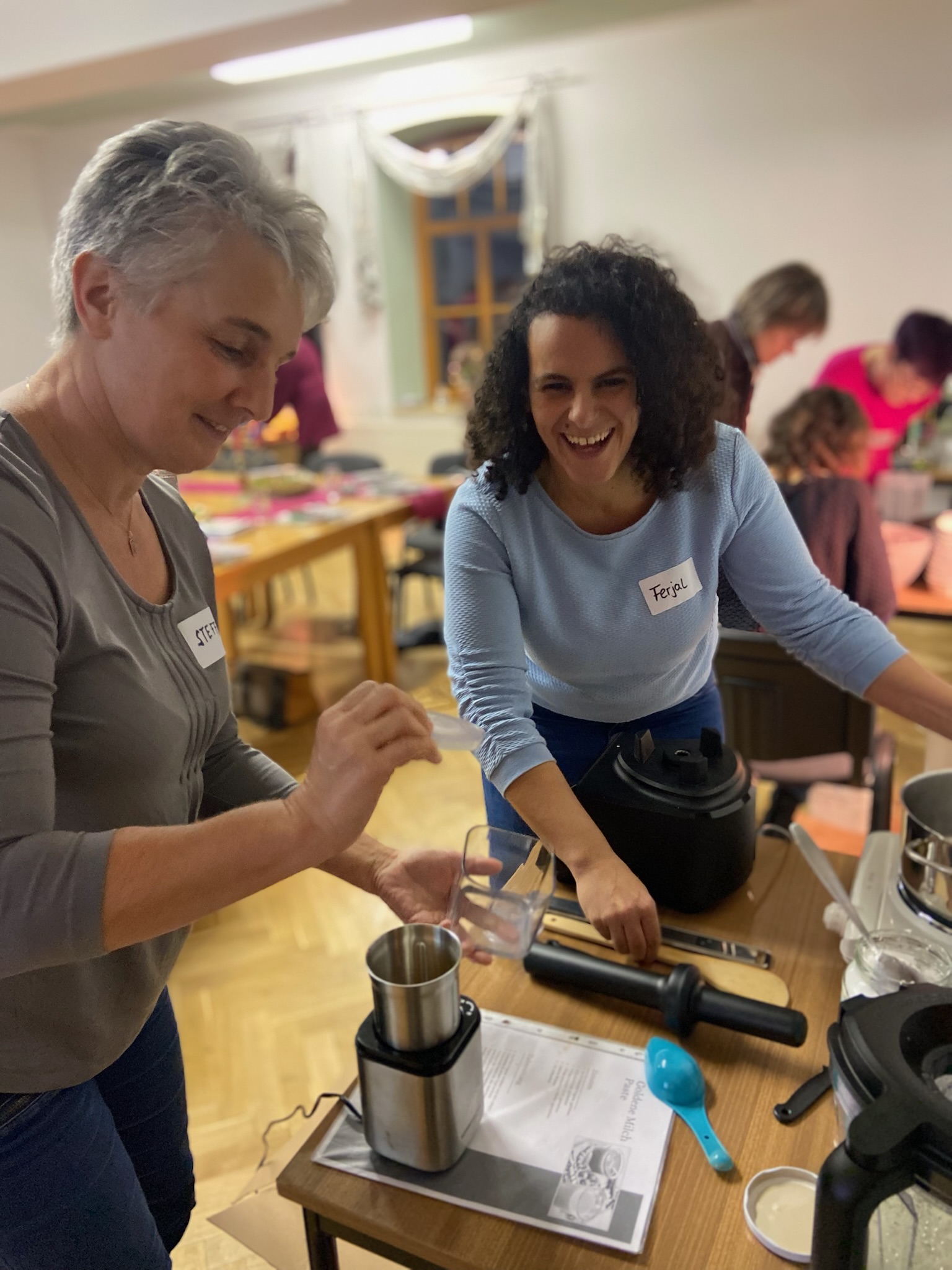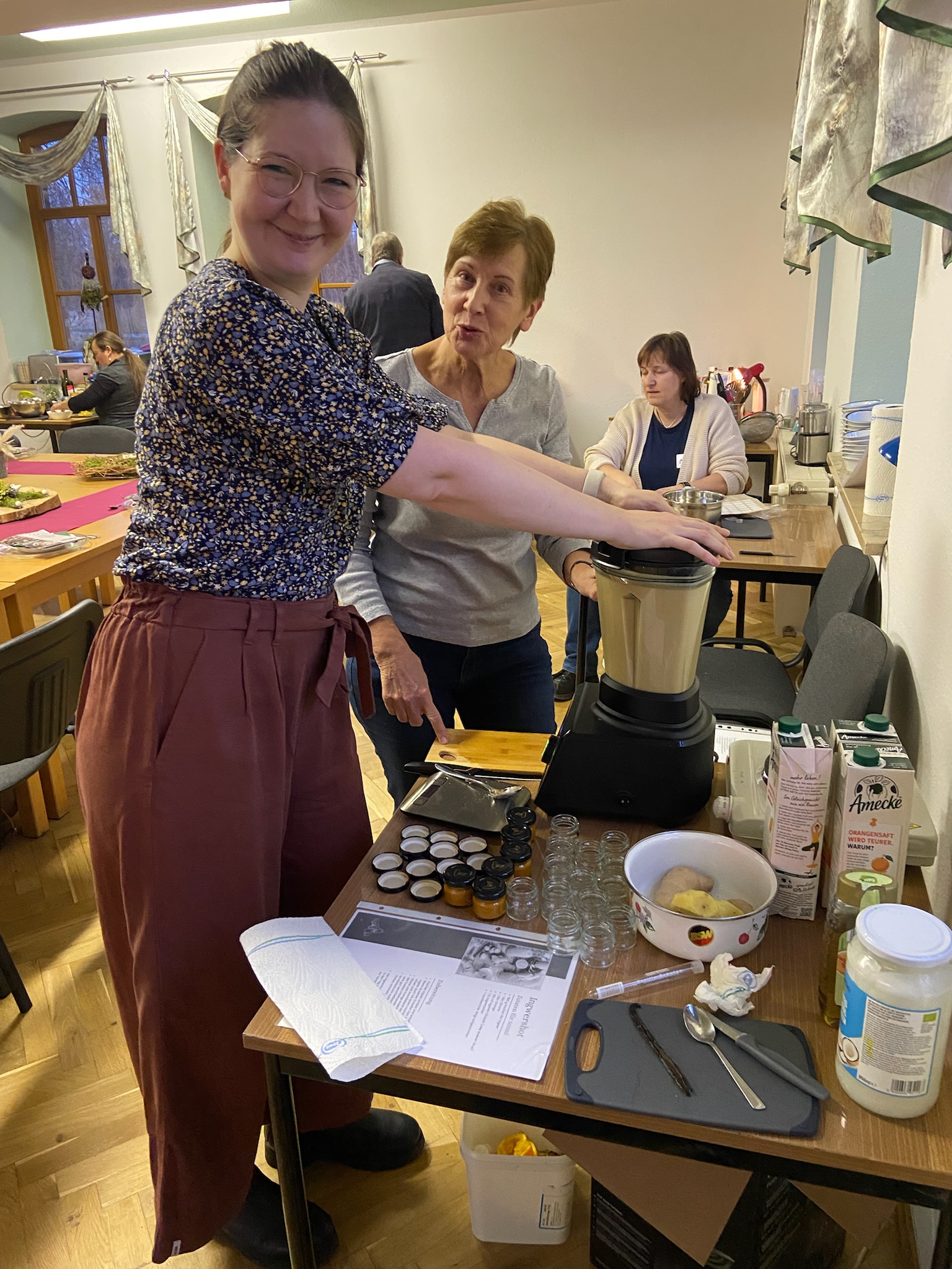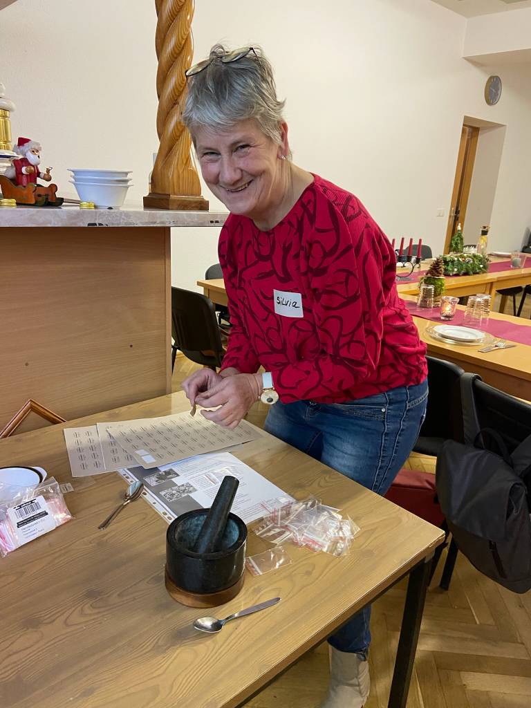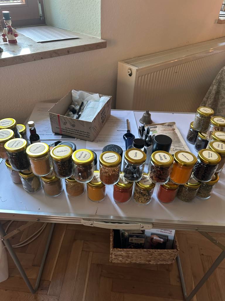 Danach bleibt noch genügend Zeit um das Menü der Gewürze vorzubereiten, an manchen Gewürzen zu schnuppern oder in den empfohlenen Büchern zu blättern. Das Kraut-Team der Werkstatt mit Doreen, Nicole, Ines und Youngster Lina-Sophie unterstützt und löst so manches kleine Problemchen. Selbst wenn die Sicherung des Gemeindehauses den ungewohnten Stromverbrauch nicht ganz verkraftet, behalten sie die Nerven. Einen Ingwershot, ein Döschen Goldene Milch Paste und drei Gewürzmischungen werden an die Plätze verteilt und sind kleine Geschenke zum Mitnehmen. — Es weihnachtet sehr.