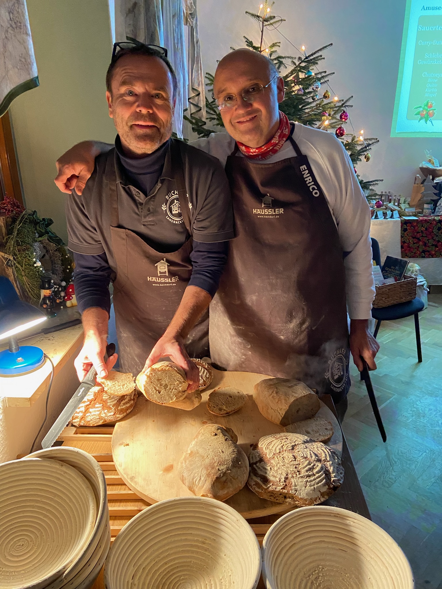 Auch zwei verschiedene Brotsorten sind auf dem Plan der Backgruppe: ein Roggen-Sauerteigbrot sowie ein Hefegewürzbrot. Sie sollen noch ganz warm, frisch aus dem Holzbackofen das heutige Menü eröffnen. Enrico und Hartmut stehen den Interessierten in gewohnt fröhlicher Manier mit Rat und Tat zur Seite, teilen ihr reichhaltiges Wissen gern und packen auch selbst mit an. Nebenbei wird noch ein wärmender Punsch bereitet, der Seele und Körper wärmt. — Es weihnachtet sehr.