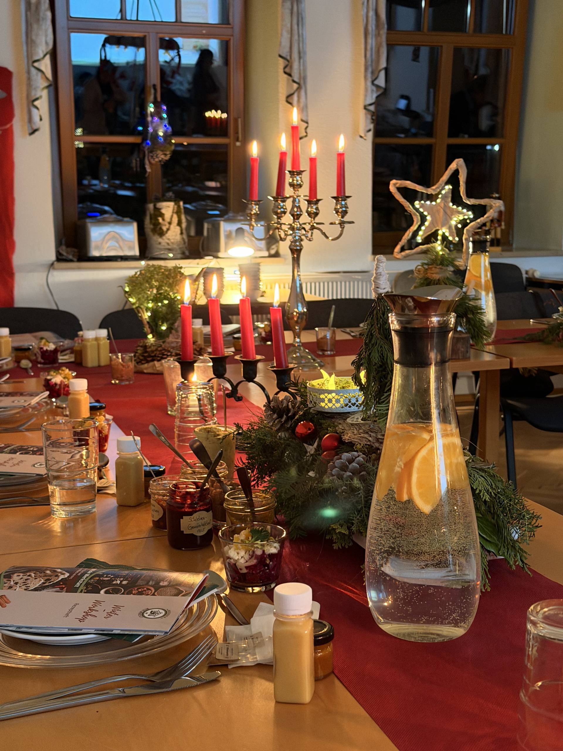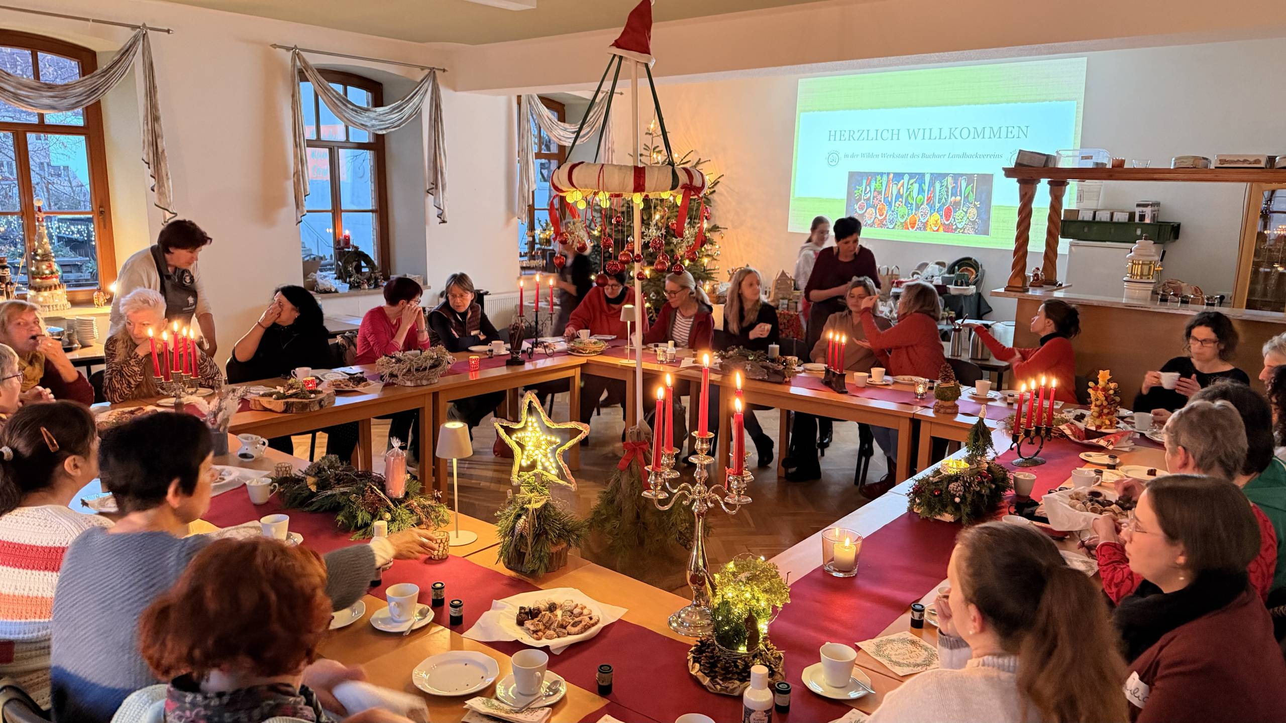 Die Sonne taucht den Buchaer Dorfteich in ein letztes goldenes Licht, als die ersten Teilnehmer am Freitagnachmittag eintreffen. Wie immer hat unsere Ines den Raum festlich geschmückt und der Anblick zaubert ein Lächeln auf die Gesichter der Besucher. Eine von ihnen steht ganz still im Raum und sagt: „So schön und liebevoll habt ihr das geschmückt, das muss ich erst einmal auf mich wirken lassen.“ Und damit lässt sie auch die Herzen des Werkstattteams vor Freude erglühen wie ein Adventslicht. — Es weihnachtet sehr.