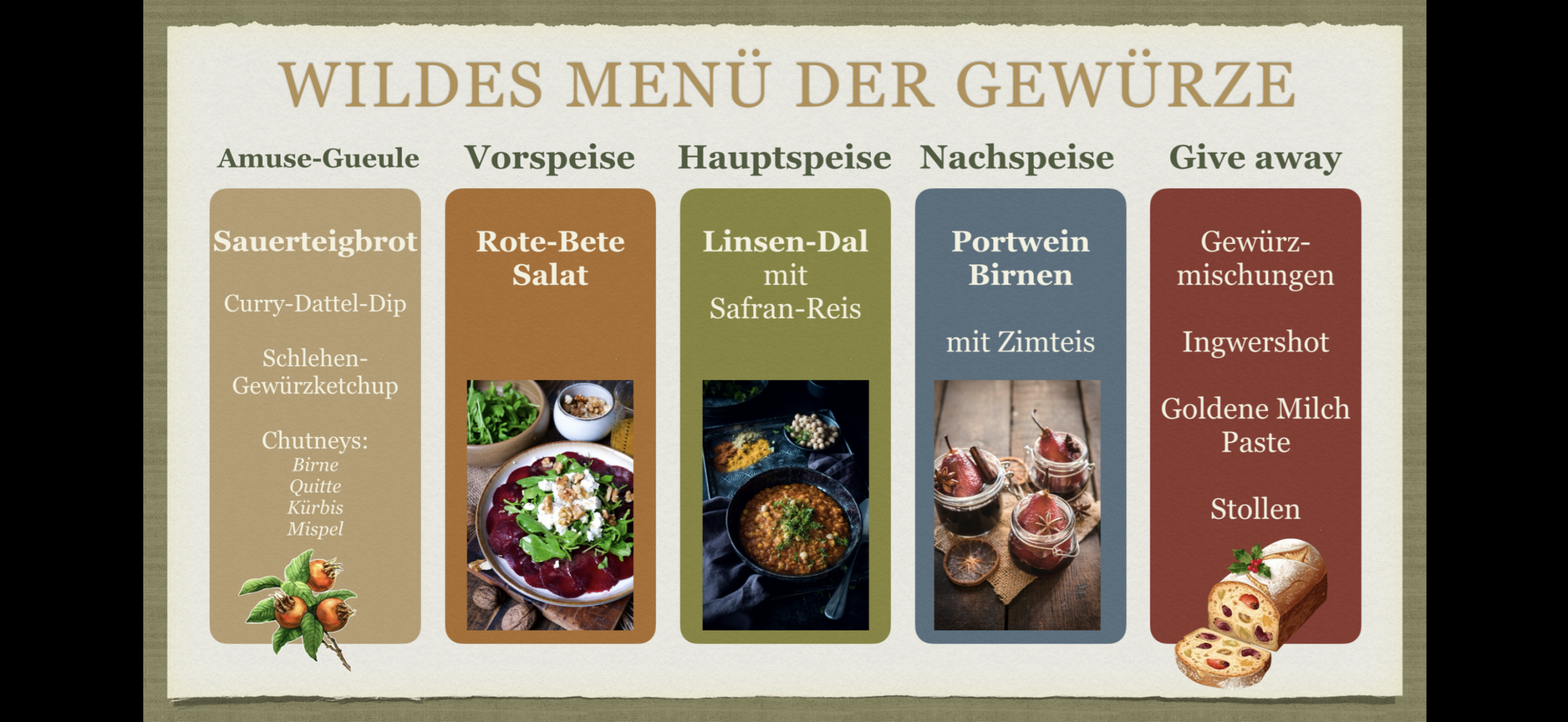 Das Thema kann weihnachtlicher nicht sein, denn wir widmen uns in diesem Jahr den Gewürzen. Ob im Weihnachtsgebäck, dem Stollen, einer wärmenden Goldenen Milch oder leckeren Gerichten – überall spielen sie eine Rolle. Auch die gesundheitlichen Wirkungen der Gewürze auf unseren Körper, ihre Bedeutung in der Menschheitsgeschichte und Kultur spielen im Workshop eine Rolle, zu dem sich fast 50 Gäste angemeldet haben.