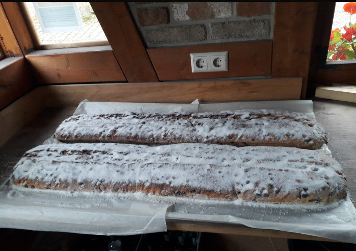 In Vorbereitung für unsere Weihnachtsmarkt, der am 13.12.25 stattfinden wird, buck unsere 1. Backfrau Katrin wieder einen 2m Stollen mit einem Gewicht von 30kg. Auf ein Stück davon dürfen sich alle Besucher des Marktes schon freuen.